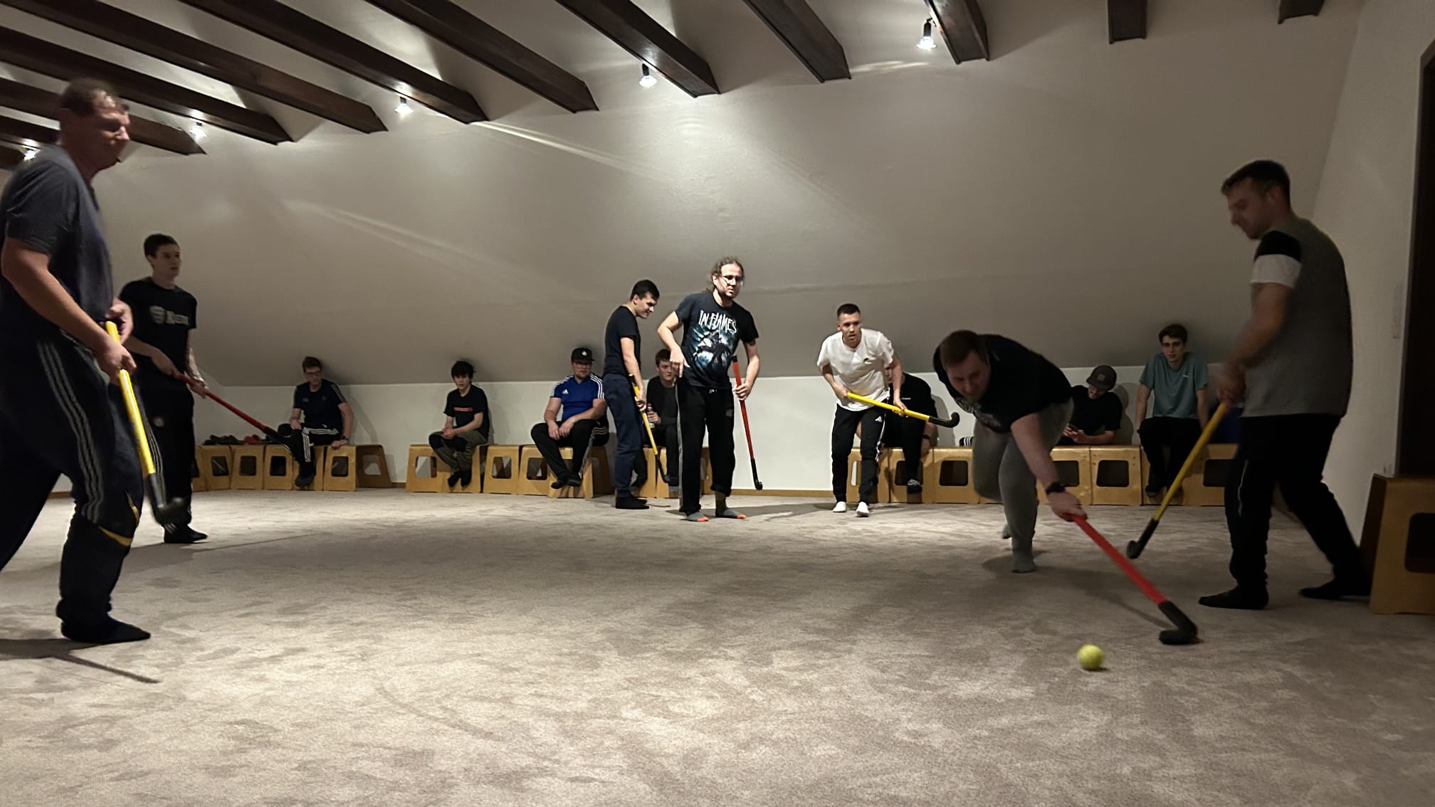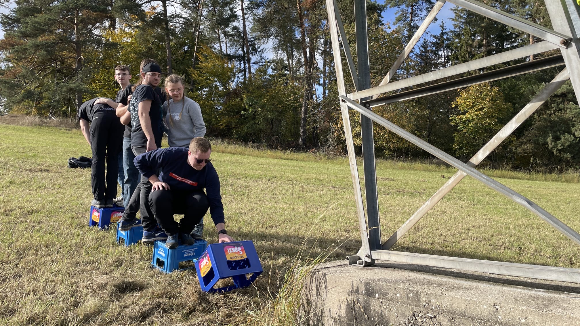Am nächsten Tag gab es zur Stärkung am Morgen ein Weißwurstfrühstück. Im Nachgang begaben sich vier Gruppen nacheinander auf eine mehrstündige Schnitzeljagd, wobei den teilnehmenden Teams unterschiedliche Aufgaben gestellt wurden. So galt es ein „Spinnennetz“ aus Feuerwehrleinen zu durchqueren, ohne dabei das Seil zu berühren. Auch im Kugelstoßen, Wettessen, Buchstabenlegen, Kastenrennen und dem Wenden eines Müllsacks durften die Gruppen ihr Können und Geschick unter Beweis stellen. Nach dem Abendessen stand dann noch ein Hockeyturnier auf dem Programm, wobei insgesamt sechs Teams gegeneinander antraten.